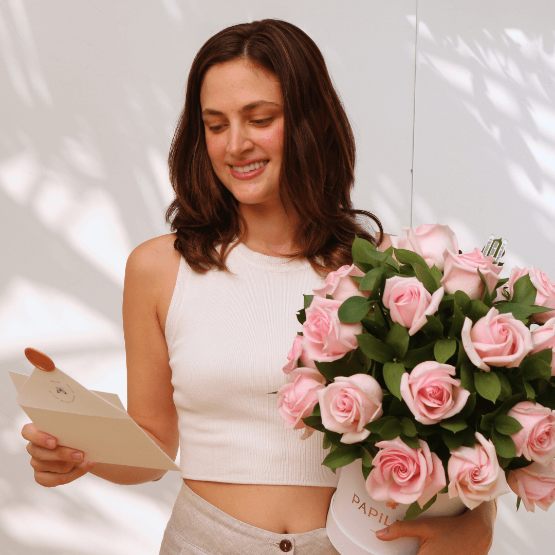 Las rosas rosadas representan admiración, aprecio, cariño y gratitud. Al estar junto al verde del follaje, logran el balance perfecto para ser un arreglo romántico, delicado y elegante.