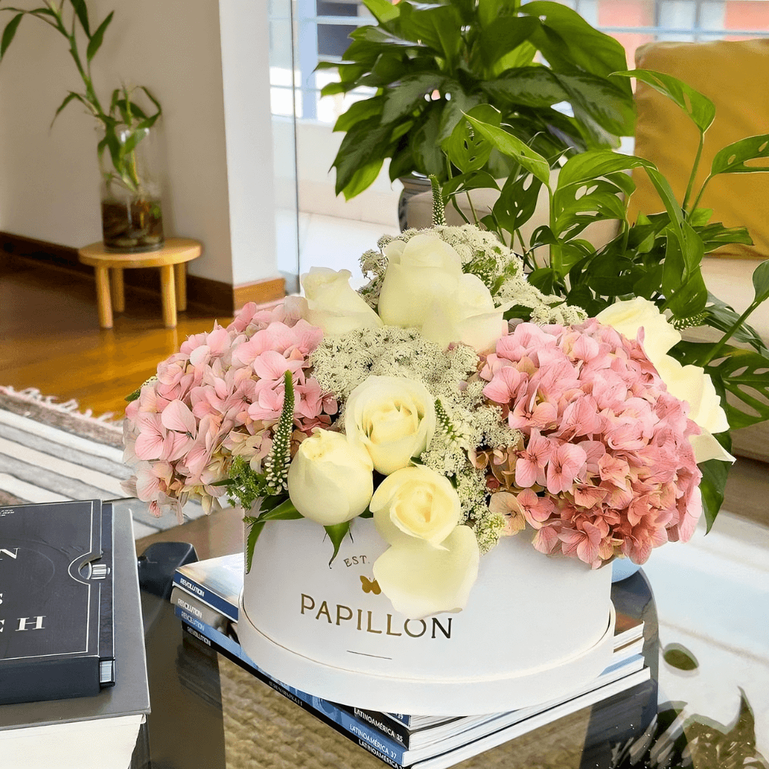 Nuestro majestuoso Hatbox Roma combina la elegancia de las rosas blancas, la dulzura de las hortensias rosadas y la belleza de otras flores en un arreglo grande lleno de emociones. Perfecto para expresar amor profundo y sincero en ocasiones especiales.