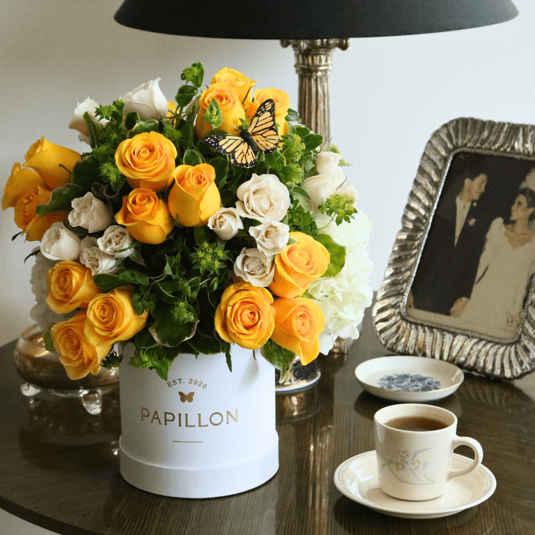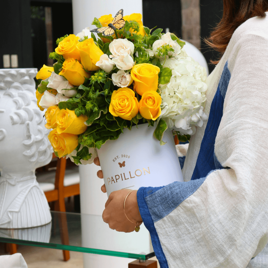 El Hatbox Sicilia combina la alegría de las rosas amarillas, la delicadeza de las mini rosas blancas, la suavidad de las hortensias blancas y la frescura del follaje en un arreglo mediano lleno de optimismo. Perfecto para celebrar momentos felices y llenos de luz.